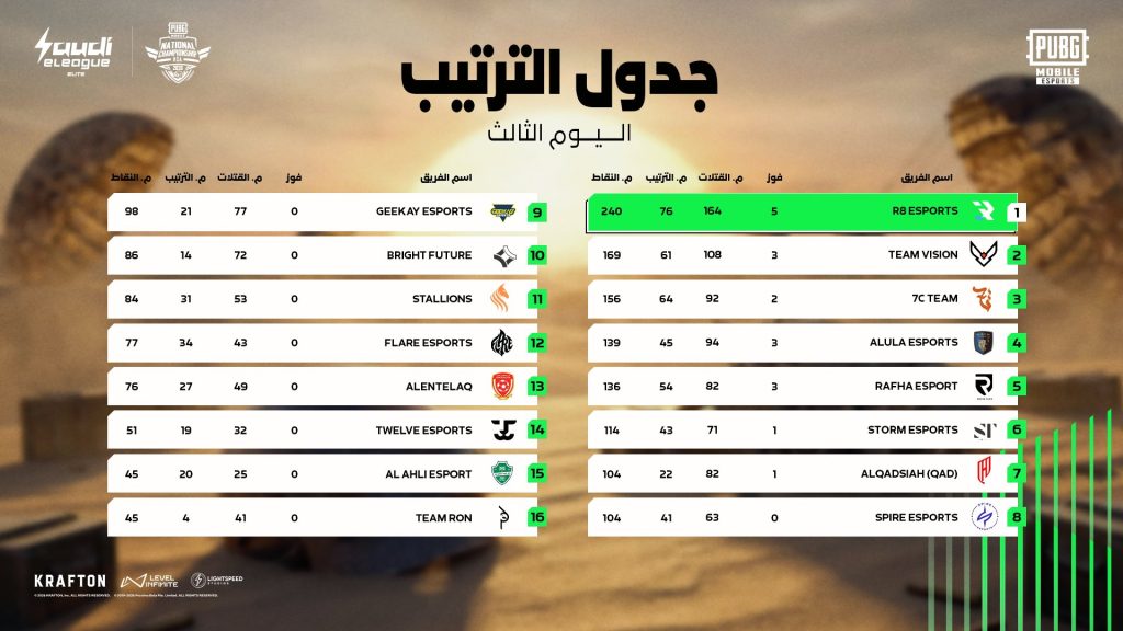 أنهى فريق نادي رفحاء للرياضات الإلكترونية مشاركته في نهائيات الدوري السعودي للرياضات الإلكترونية للعبة بابجي موبايل، محققًا المركز الخامس، ليواصل حضوره التنافسي ويضمن مقعدًا في المرحلة القادمة من المنافسات الإقليمية.